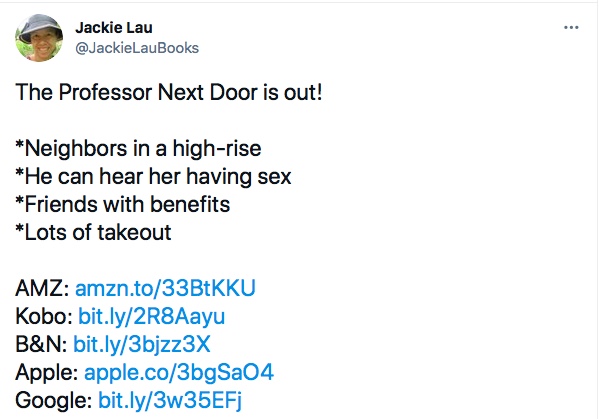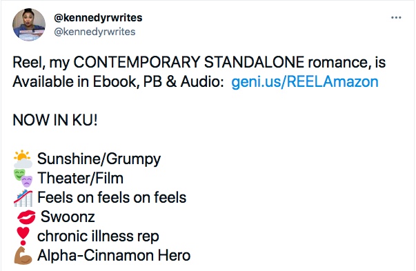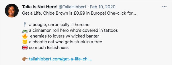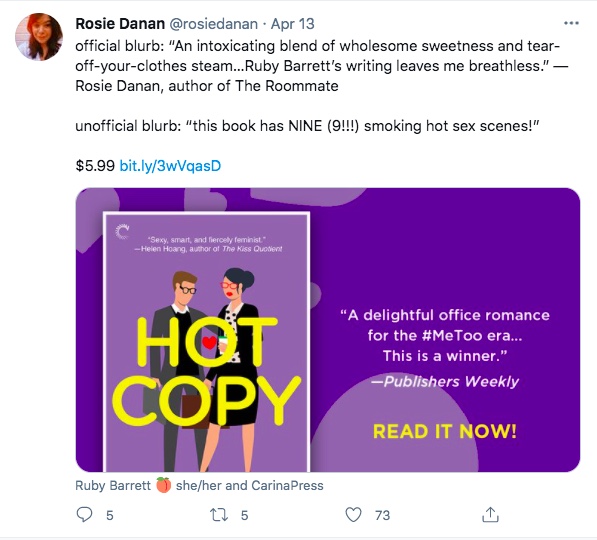 It bears mentioning, of course, that Twitter epitext exists at the crossroads of promotion and paratext. Most literary criticism I’ve read doesn’t seem overly concerned with the distinction between the two: between paratextual functions (framing how readers see, experience, and evaluate the content of books) and promotional functions (getting potential readers to open their wallets and buy a book). In some ways, ignoring the paratextual/promotional distinction is a problem, especially because at times the two are at odds. To give just one example, “rom-coms” are very popular right now, and promotional epitext often seems to suggest something is a rom-com to boost sales, even when it isn’t. This approach seems deeply antithetical to the assumed function of paratext, which is to prepare the reader for the actual contents of what they’re about to read.