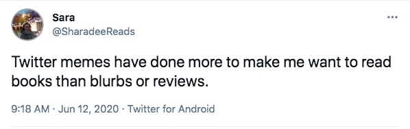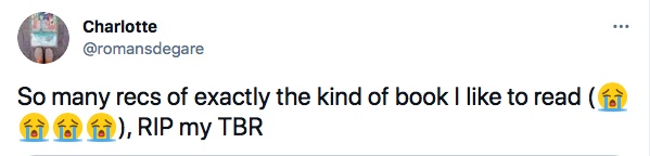 So, what does Twitter epitext look like, and why is it worth considering as a separate phenomenon? In the broadest sense possible, Twitter epitext could really be anything anyone says about a book on Twitter- so long as another reader might encounter it, and find it influences how they approach their reading. For the sake of manageability and simplicity, I’m going to stick to the kinds of things that people put on Twitter to encourage people to buy books. A lot of what I’m going to say about Twitter epitext might also be applicable to facebook or bookstagram or review blogs, but since Twitter is the only social media platform I regularly use, I’m going to stick to that. For the first part of my post I’m going to try to suss out what makes Twitter epitext unique, both as a means of selling and preparing readers for books. And then I’ll talk a little bit about how Twitter epitext has changed the role readers play in the life of a book in the world.