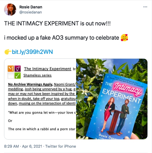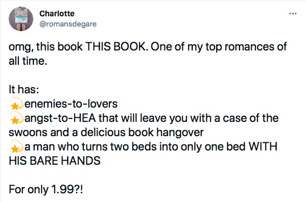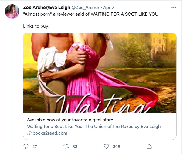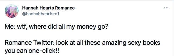 It bears mentioning that not all romance readers want books with sex on the page, and not all those who do read sex on the page find it to be their primary motivation for reading romance. However, for the large number of readers who do like such things, Twitter epitext that talks frankly and in unembarrassed detail about the sex in a book mirrors the kind of frank and unembarrassed sex positivity many readers hope for in their novels. For someone in a mood to read a book that has 9 sex scenes rather than 1, Twitter epitext can be one of the most reliable places to learn that information, which is rarely found (at least not clearly) in other places like the front or back cover.
